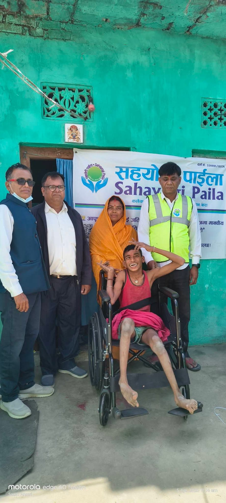 कलैया उपमहानगरपालिका वडा नं. २५ निवासी सिकेन्द्र साहका १५ वर्षीय छोरा रामजी साहलाई आवतजावतमा सहजता प्रदान गर्ने उद्देश्यले आज एक कार्यक्रमका बीच ह्वीलचेयर सहयोग गरिएको छ। शारीरिक अवस्थाका कारण लामो समयदेखि हिँडडुलमा कठिनाइ भोग्दै आएका रामजीलाई “सहयोगी पाइला” संस्थाको समन्वयमा उक्त सहयोग उपलब्ध गराइएको हो।